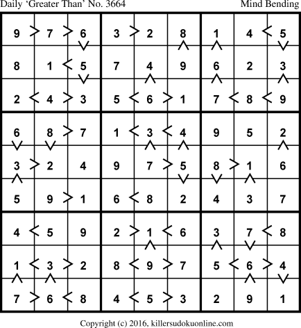 Weekly “Greater Than” Killer sudoku for week starting 4/25/2016