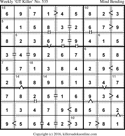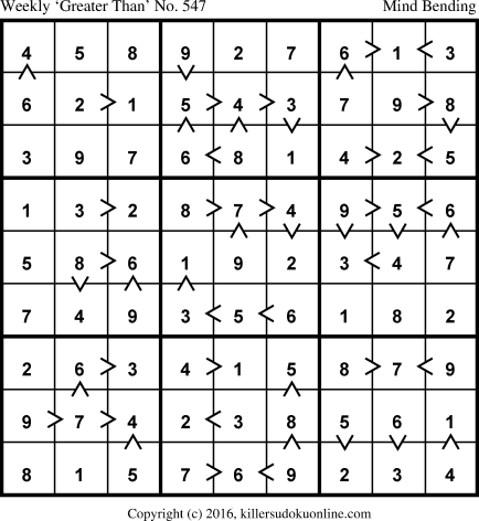 Weekly “Greater Than” Killer sudoku for week starting 7/11/2016