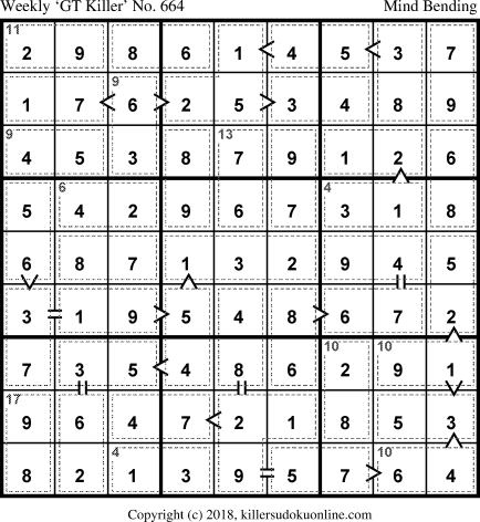 Weekly “Greater Than” Killer sudoku for week starting 12/31/2018
